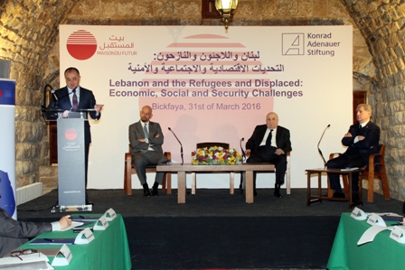 A seminar under the title of “Lebanon and the Refugees and Displaced: Economic, Social and Security Challenges, the Need for a Comprehensive National Strategy” was held by La Maison du Futur (MDF) in cooperationwith Konrad-Adenauer-Stiftung (KAS), at MDF headquarter in the Bekfaya Serail on Thursday, 31 March 2016. The conference comes at a time when the bloody conflict in Syria enters its fifth year while Lebanon is hosting that highest percentage of Syrian refugees in numbers and in their ratio to the total population. The number of refugees is estimated nowadays at 1.2 million refugees and they constitute a threat against an already exhausted country. The refugee crisis today reaches beyond the humanitarian dimension and its consequences are bordering a national security threat against the country. The conference aimed at looking into the impact of these waves of refugees on the economy, social fabric, infrastructure, demographic balance, security and political stability of Lebanon. It also attempts to establish a national strategy to assist Lebanese authorities in enhancing national security, and playing an active role in facilitating the response coordination and planning of this crisis, in addition to investing in the sustainable development of host communities and dealing with the urgent humanitarian needs of refugees.
