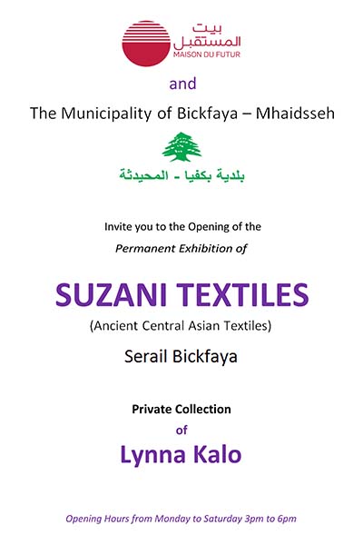 بدعوة من بيت المستقبل وبلدية بكفيا المحيدثة افتتح معرض " سوزاني" للأقمشة التراثية الأوزباكستانية (تاشكانت) المجموعة الخاصة للسيدة لينا كالو في بيت المستقبل في سرايا بكفيا بحضور الرئيس أمين الجميّل وعقيلته السيدة جويس، الرئيس فؤاد السنيورة وعقيلته السيدة هدى، الوزيرة السابقة نايلة معوض، رئيسة بلدية بكفيا المحيدثة السيدة نيكول الجميّل، رئيس نقابة المقاولين الشيخ فؤاد الخازن وحشد من الشخصيات الإجتماعية والإعلامية.
